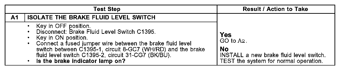 PINPOINT TEST A: RED BRAKE WARNING INDICATOR ALWAYS ONTest A1: