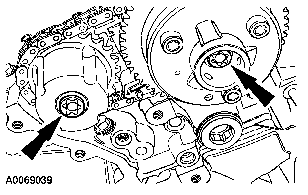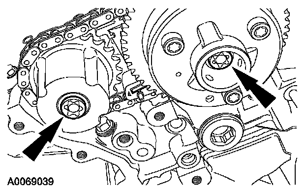 2. Using new bolts, install the LH VCT unit and exhaust camshaft sprocket bolts finger-tight.