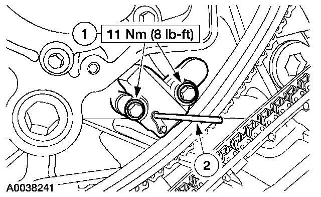 CAUTION: Using the special tool, apply 10 Nm (89 inch lbs.) counterclockwise to the LH exhaust camshaft sprocket.