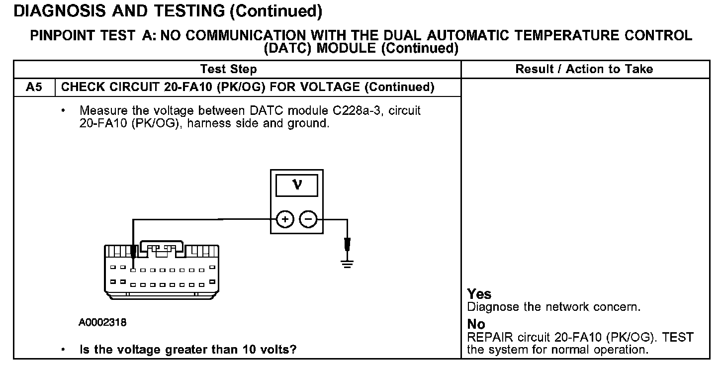 Under normal operation, the Dual Automatic Temperature Control (DATC) module receives battery voltage through circuit 29-FA10 (OG/GN) and ignition voltage through circuit 20-FA10 (PK/OG). A ground is provided for the DATC module through circuit 31-FA10 (BK).