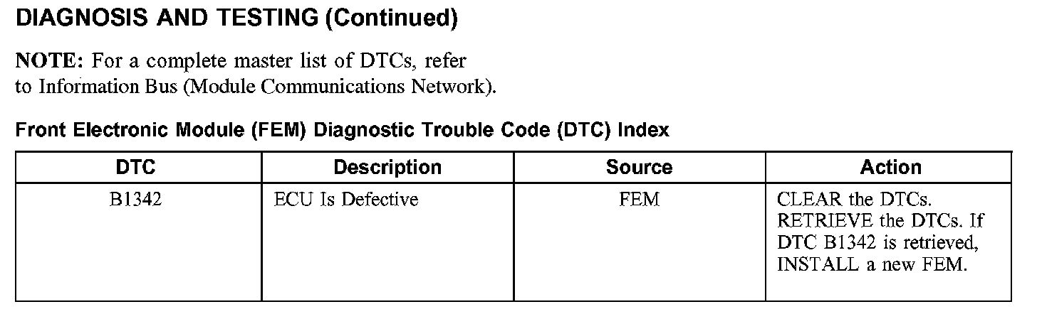 Front Electronic Module (FEM) Diagnostic Trouble Code (DTC) Index