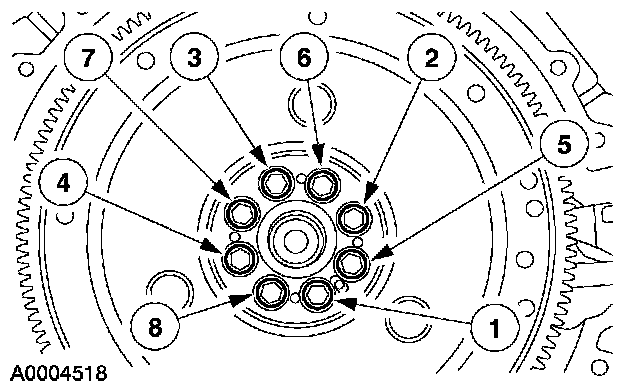 Install the flexplate bolts and tighten in two stages in the sequence shown.