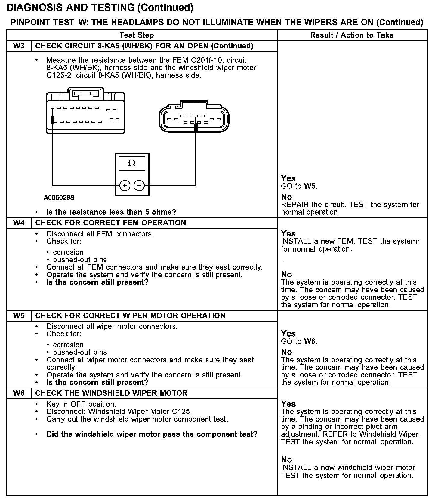 PINPOINT TEST W: THE HEADLAMPS DO NOT ILLUMINATE WHEN THE WIPERS ARE ONTest W1-W3: