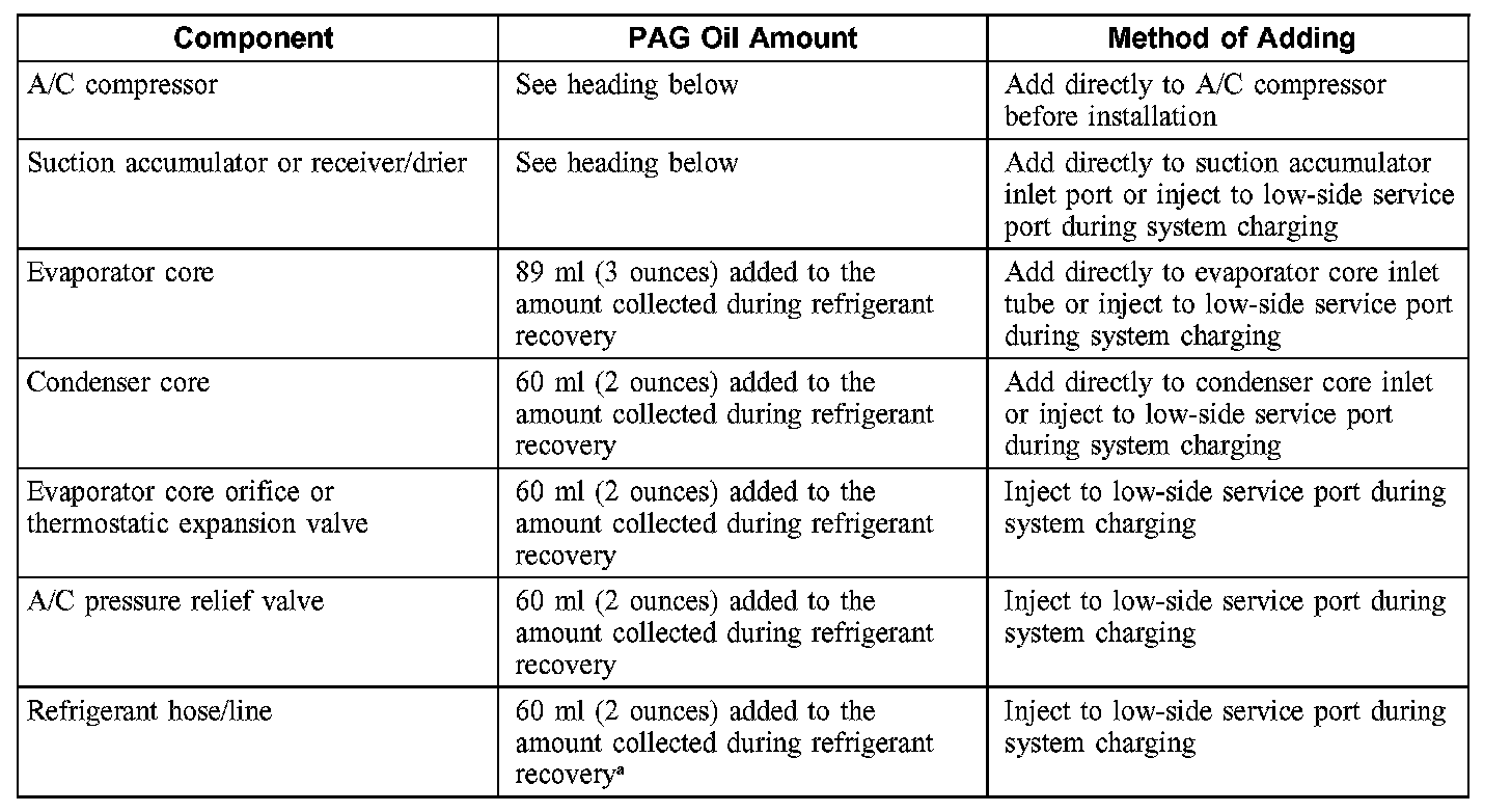 CAUTION: During normal A/C operation, oil is circulated through the system with the refrigerant, and a small amount is retained in each component. If certain components of the system are removed for new installation, some of the refrigerant oil will go with the component. To maintain the original total oil charge, it is necessary to compensate for the oil lost by adding oil to the system with the new part.