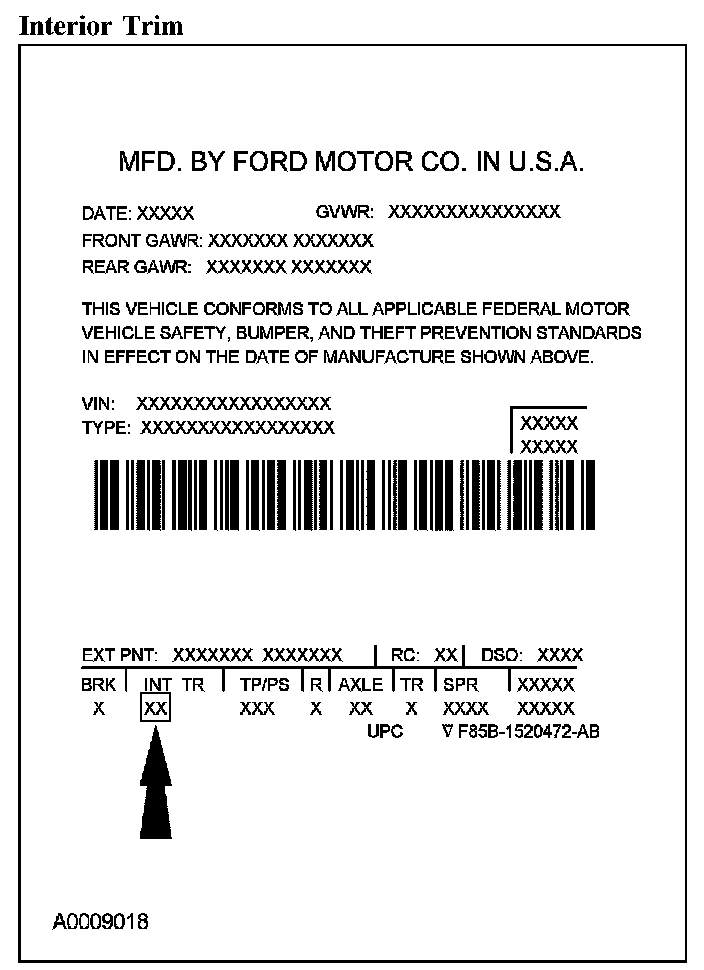 Interior trim codes are listed as a 2-part code. The first character identifies the interior trim type. The second character identifies the interior trim color.