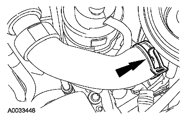 6. Release the auxiliary coolant flow pump-to-heater hose and tube assembly hose clamp and disconnect the hose.