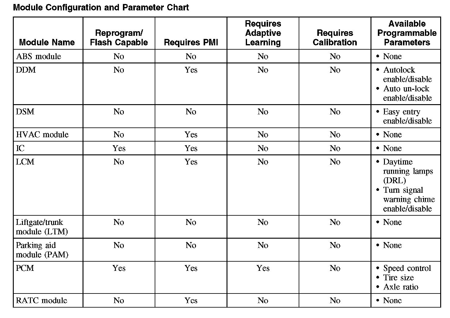 Programmable parameters are customer preference items that may be modified by the dealer via scan tool or in some cases modified by the customer following a procedure listed in the vehicle Owner's Literature. While many configuration options may exist for a module, only a few of these options are programmable parameters.