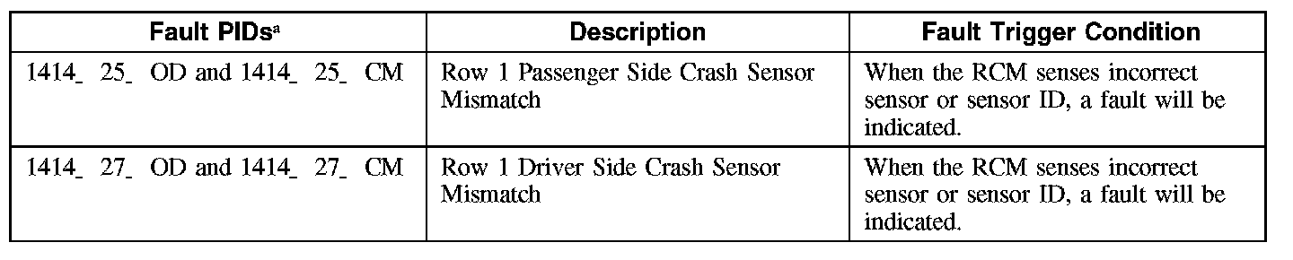 The restraints control module (RCM) monitors the communication condition and circuits of the impact sensors and the occupant classification sensor (OCS) system for an embedded vehicle ID.