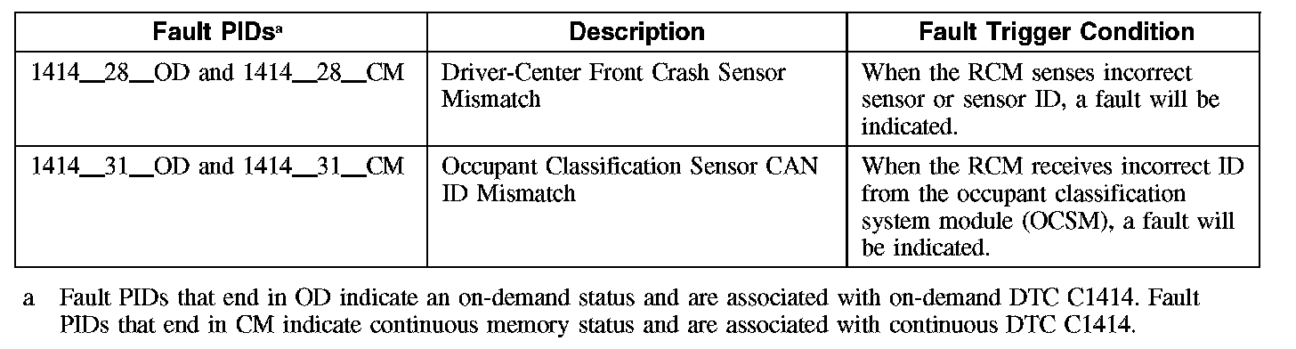 If the RCM receives conflicting information from the impact sensors or OCS system it will store DTC C1414 in memory and, depending on the fault, flash a LFC on the air bag warning indicator. The secondary air bag warning chime will also be activated.