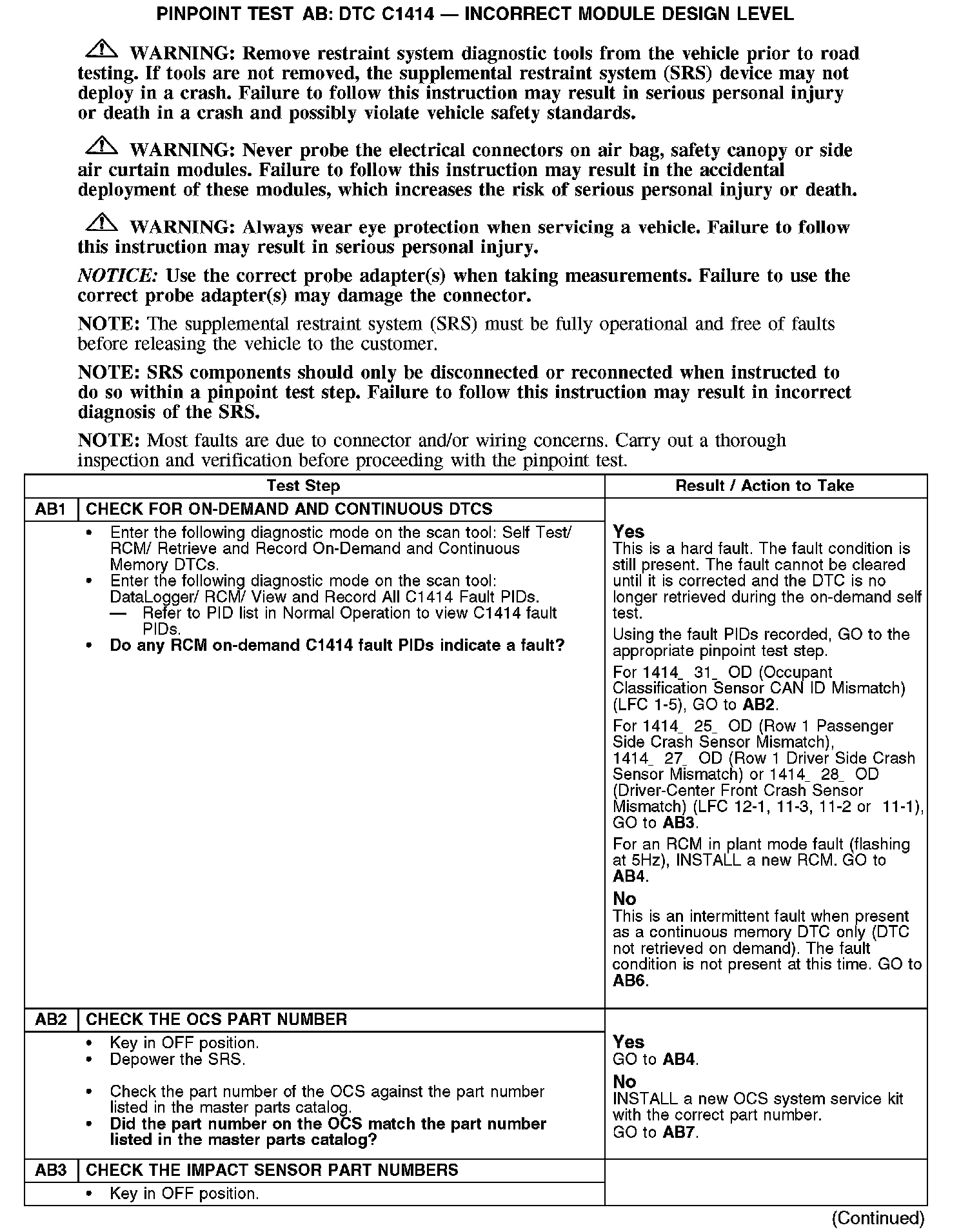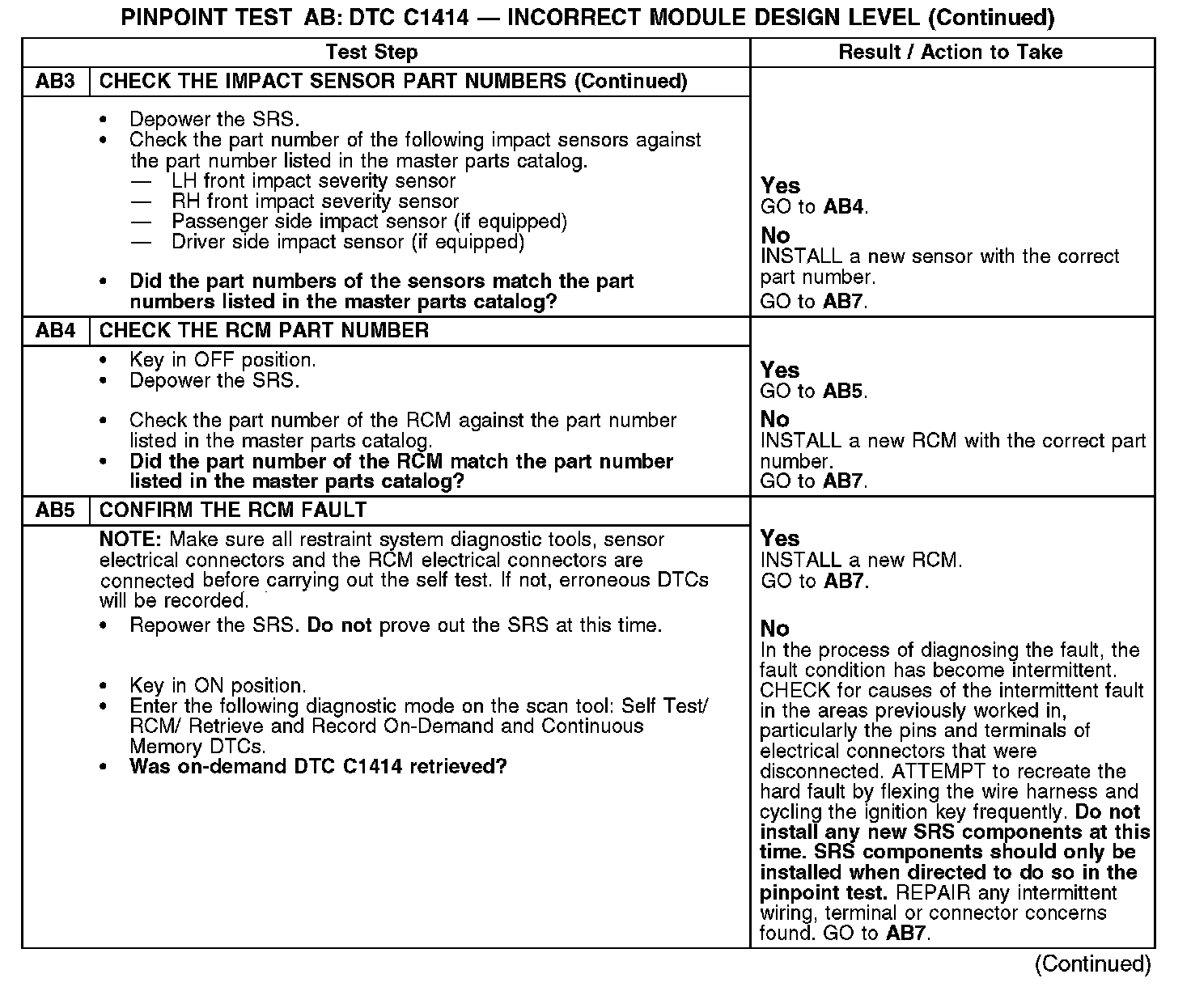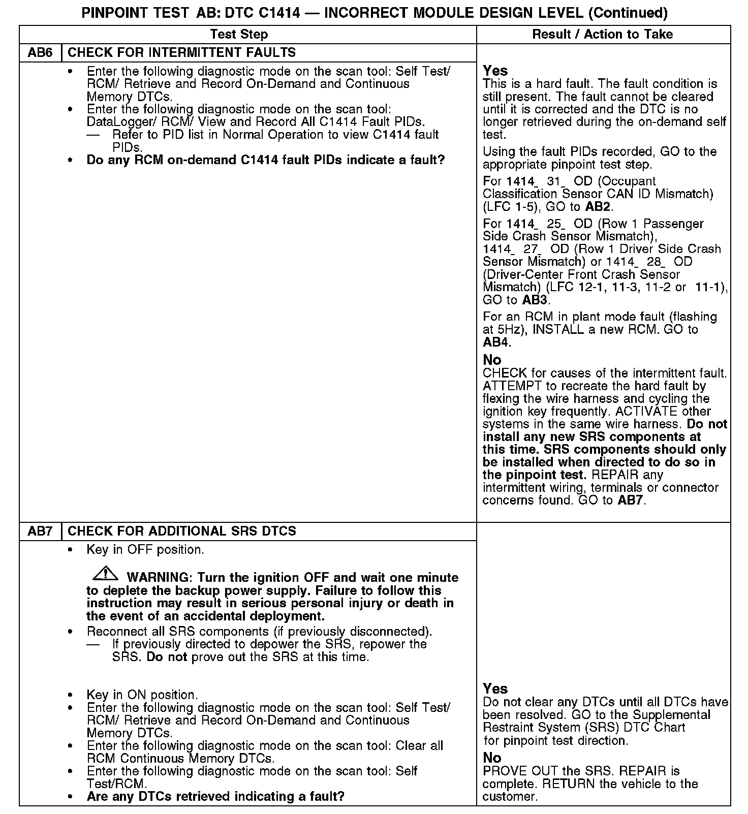 PINPOINT TEST AB: DTC C1414 - INCORRECT MODULE DESIGN LEVELLamp Fault Codes (LFCs)