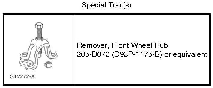 8. NOTICE: Do not tighten the front wheel hub nut with the vehicle on the ground. The nut must be tightened to specification before the vehicle is lowered onto the wheels. Wheel bearing damage will occur if the wheel bearing is loaded with the weight of the vehicle applied.