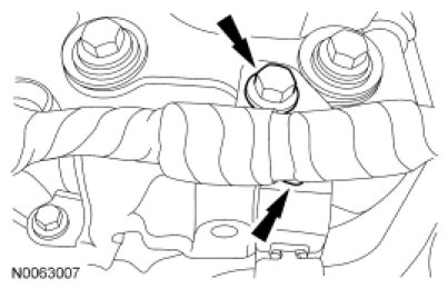 159. Install the fuel tube bracket bolt to the upper intake manifold and install the wiring harness pin-type retainer.