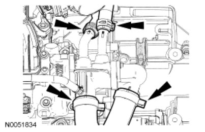65. Connect the upper radiator hose, lower radiator hose and 2 heater hoses to the thermostat housing.