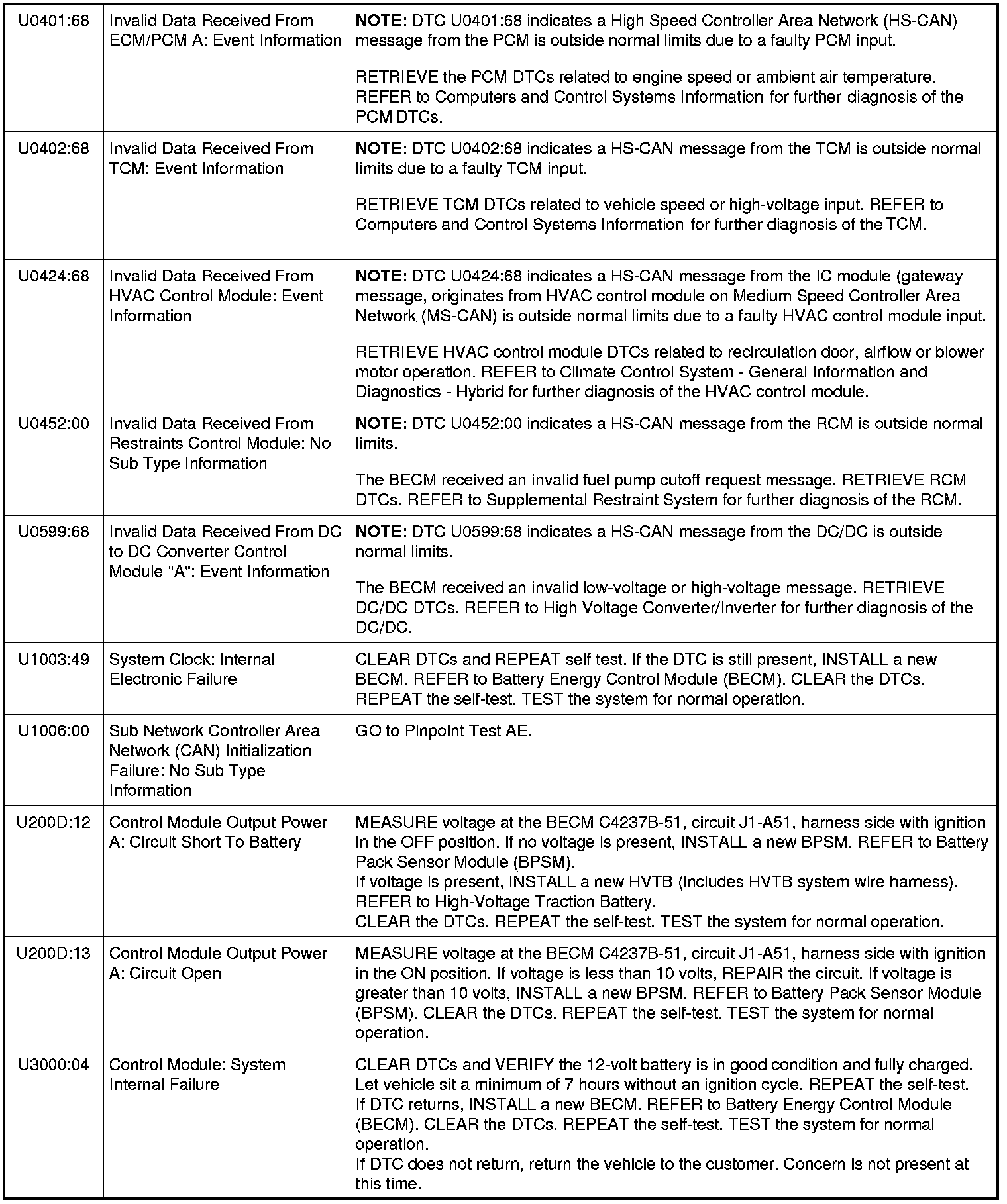NOTE: Network DTCs (U-codes) are often a result of intermittent concerns such as damaged wiring or low battery voltage occurrences. Additionally, vehicle service procedures such as module reprogramming often set network DTCs. Replacing a module to resolve a network DTC is unlikely to resolve the concern. To prevent repeat network DTC concerns, inspect all network wiring, especially connectors. Test the vehicle battery condition, refer to Battery, Mounting and Cables Testing and Inspection.