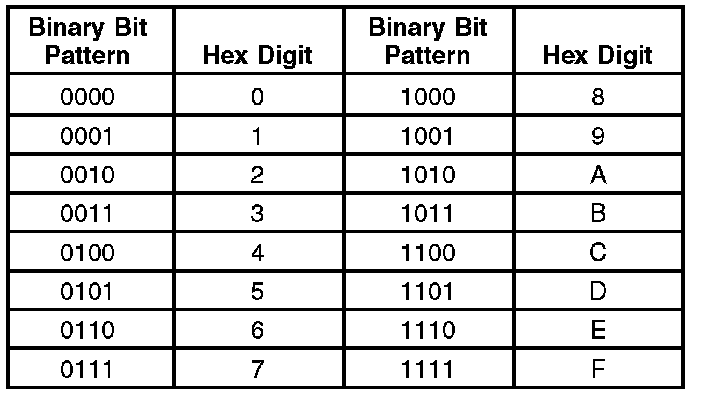 The table below shows how to decode the bits into hex digits.