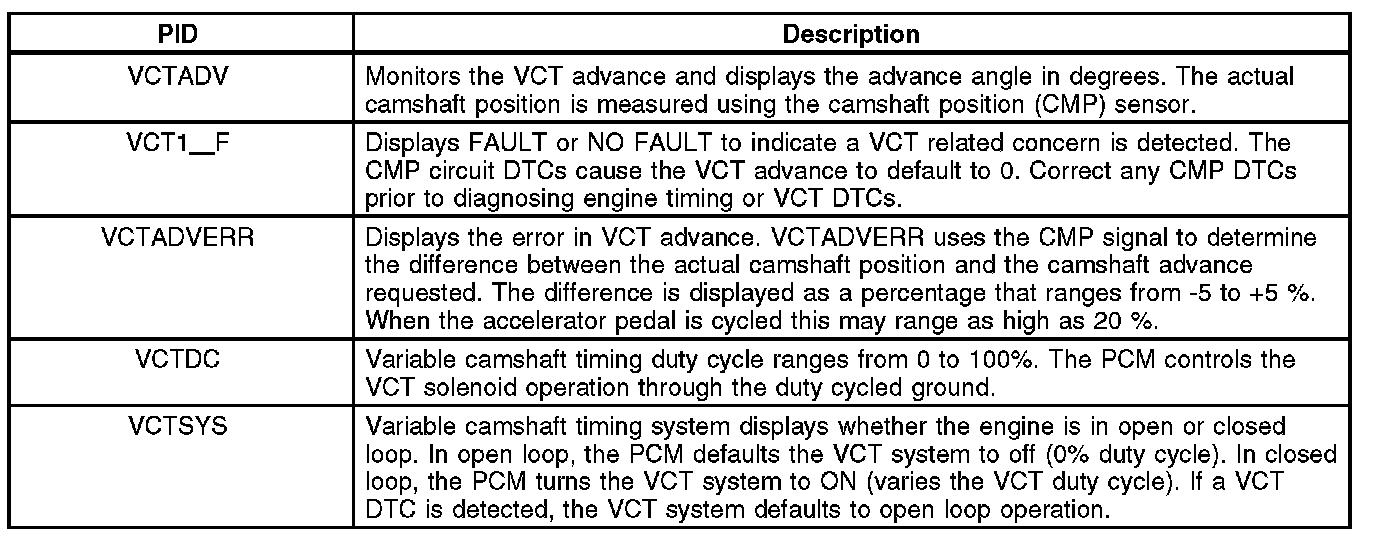 The PCM calculates and determines the desired camshaft position. It continually updates the VCT solenoid duty cycle until the desired position is achieved. A difference between the desired and actual camshaft position represents a position error in the PCM VCT control loop. The PCM disables the VCT and places the camshaft in a default position if a concern is detected. A related diagnostic trouble code (DTC) is also set when the concern is detected.