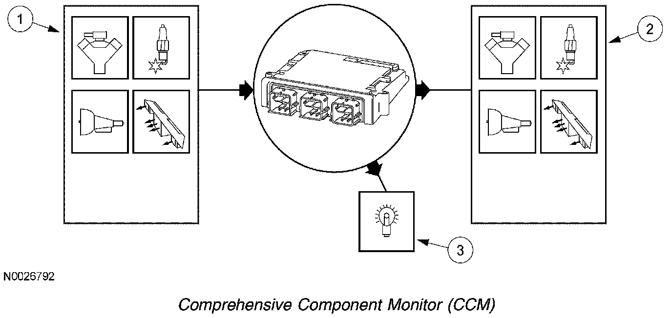 3. The CCM is enabled after the engine starts and is running. A diagnostic trouble code (DTC) is stored in keep alive memory (KAM) and the malfunction indicator lamp (MIL) is illuminated after two drive cycles when a concern is detected. Many of the CCM tests are also carried out during the on-demand self-test.