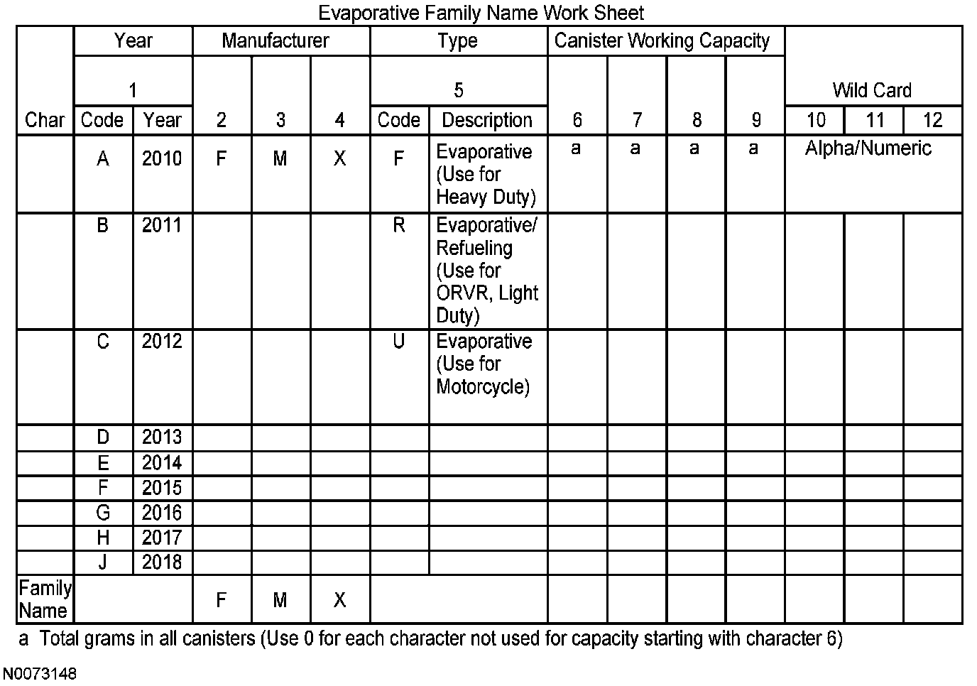 Both the engine family group and the evaporative family name are listed in the box on the emission decal as indicated in the area marked as engine evaporative family information. The first line contains the engine size and the 12-character engine family group. The second line contains the 12-character evaporative family name information. Both the engine family group and the evaporative family name are specific to the vehicle. Please refer to the Engine Family Group and the Evaporative Family Name worksheet for decoding information.