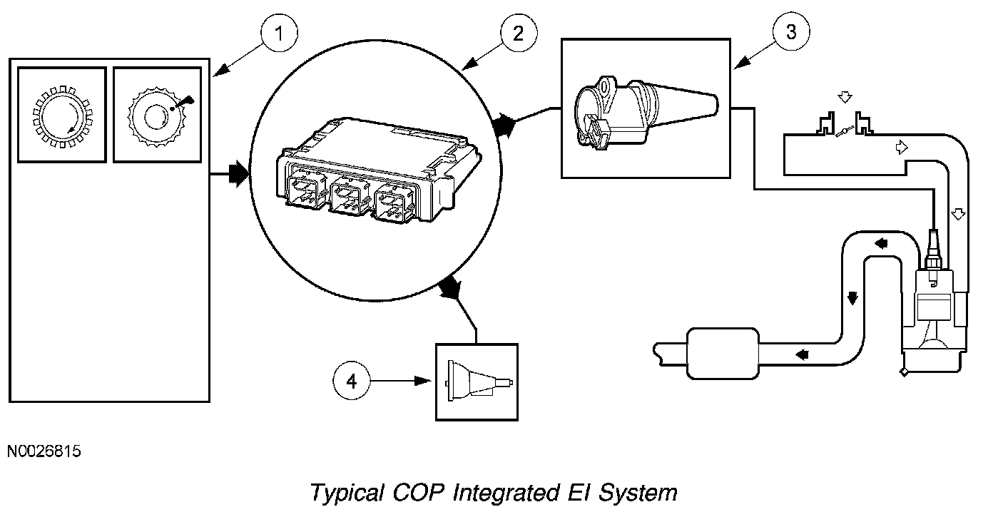 The EI system consists of a crankshaft position (CKP) sensor, coil(s) on plug (COP), and the PCM. The COP integrated EI system uses a separate coil per spark plug, and each coil is mounted directly onto the plug. The COP integrated EI system requires input from the camshaft position (CMP) sensor. Operation of the components are as follows: