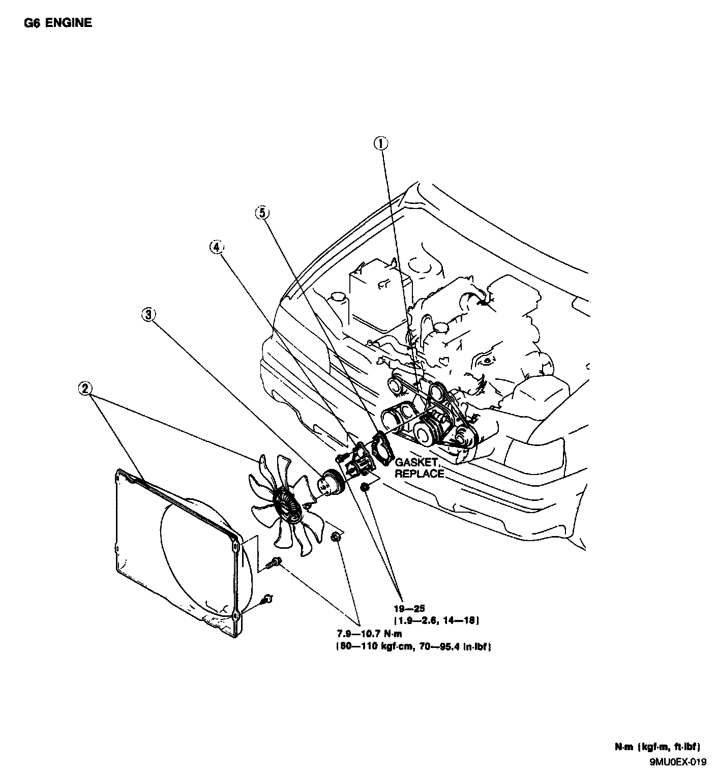 (1) Drive Belt (2) Cooling Fan And Radiator Cowling (3) Water Pump Pulley (4) Water Pump (5) Gasket:
