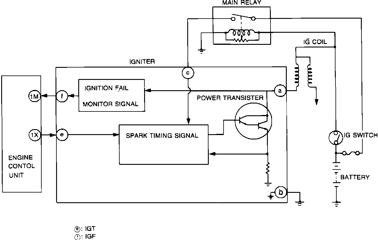 The igniter is switched "ON" and "OFF" by signals from the ECU. The ECU monitors operating conditions through various engine sensors, including a TDC sensor and engine speed/crankshaft position sensor in the distributor, and uses this information to regulate ignition timing according to pre-programmed values in the ECU memory.
