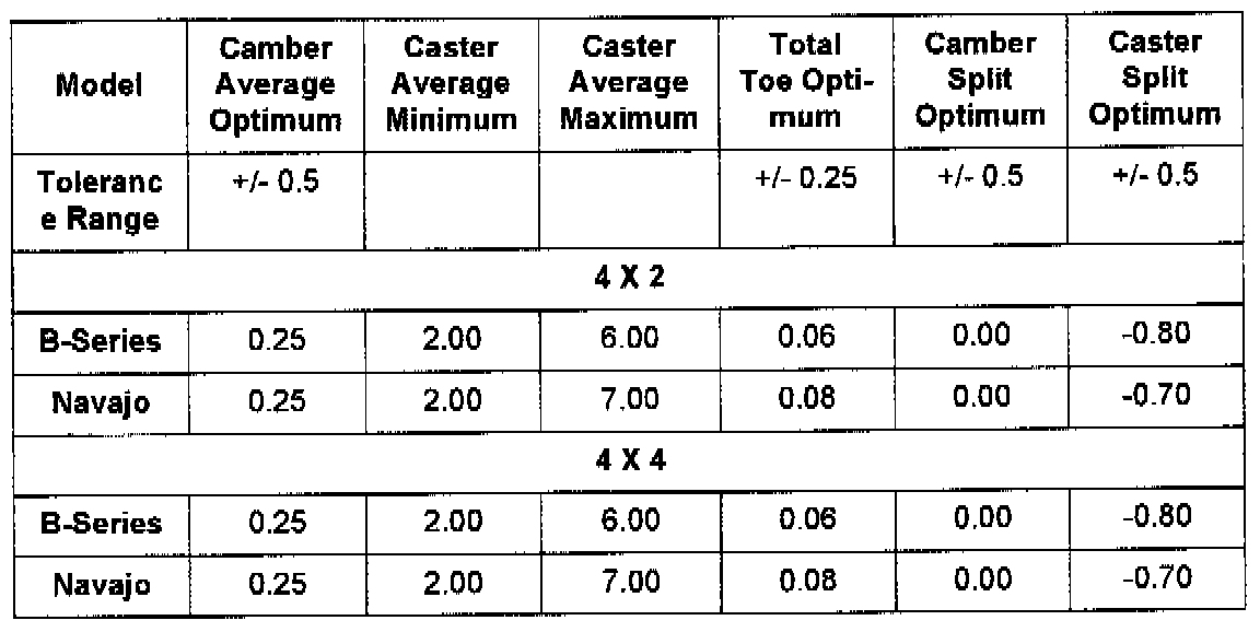The chart illustrates optimum alignment selling and recommended allowable ranges for B-series and Navajo vehicles.
