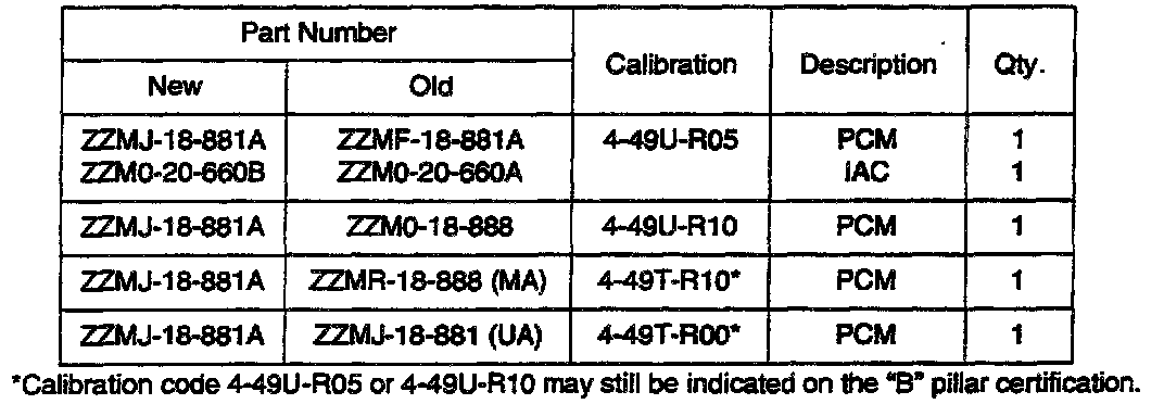 If the vehicle has calibration code of 4-49U-R05 and does not have an engineering part number of F4PF-12A650-MA or UA, the Idle Air Control Motor (IAC) must also be replaced with a new level part.