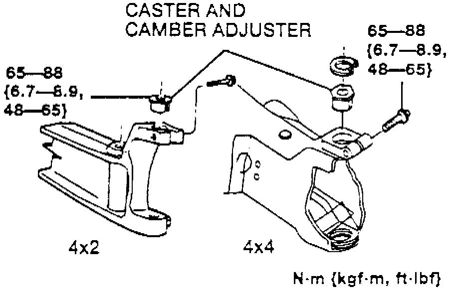 Camber and caster adjustment is possible with adjusters available in 0°30', 1°, and 1°30' increments. One adjuster is used to adjust both caster and camber, depending on orientation.1. Measure vehicle camber and caster. Note the difference between actual measurement and required specifications.
