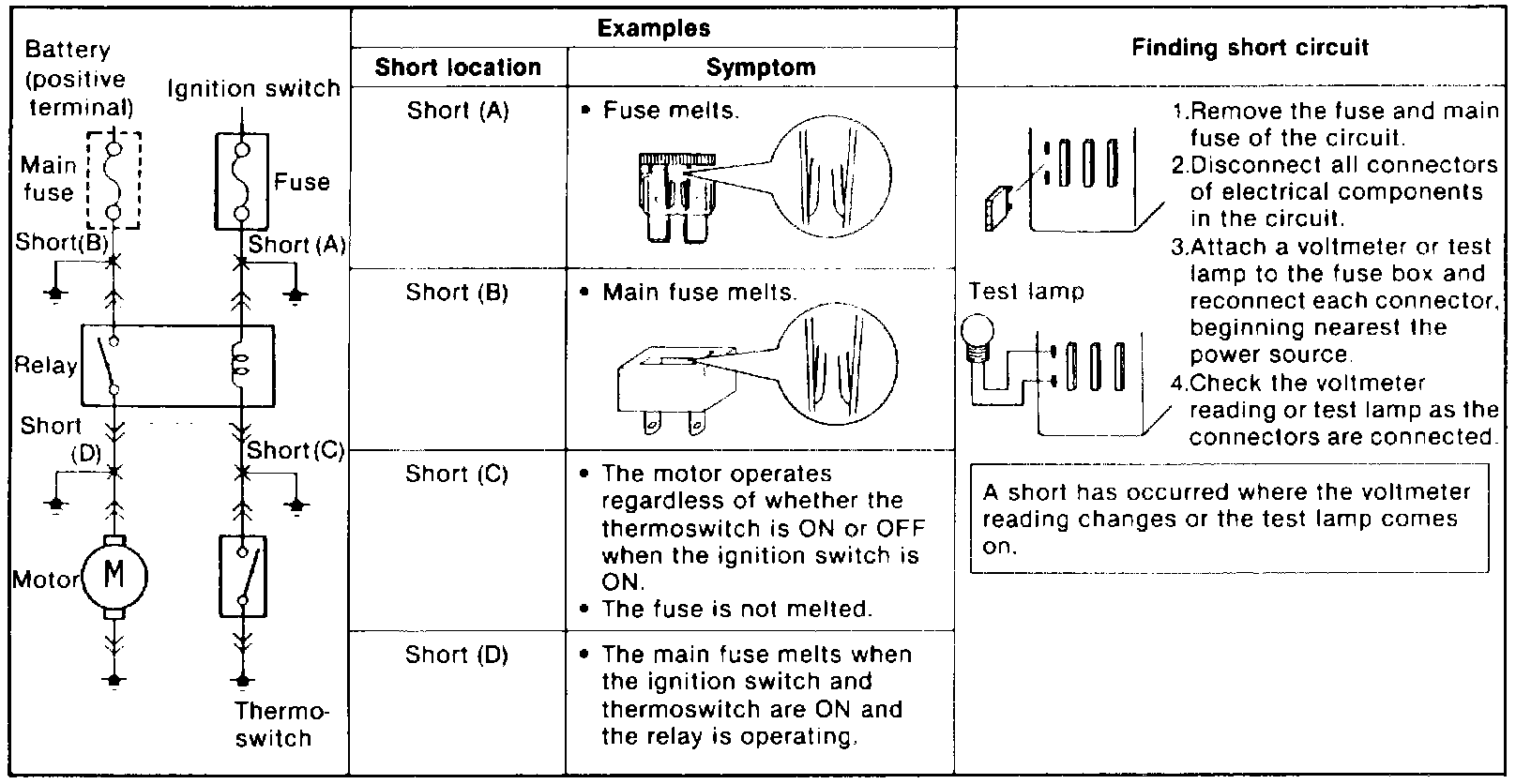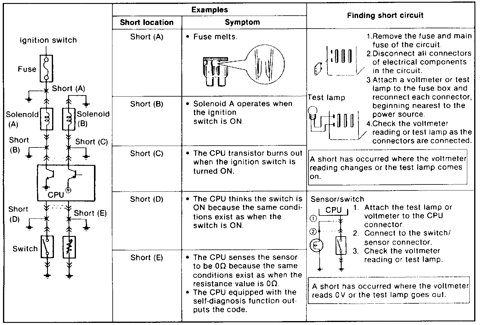 Shorts occur between the power (positive) and ground(negative) sides of a circuit. Therefore, finding a short circuit requires determining how the circuit is routed.Finding Short Circuits-Circuits Not Connected To Control Unit: