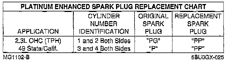 ^ If a spark plug is removed for examination, it must be reinstalled in the same cylinder. If a spark plug needs to be replaced, use only spark plugs with the service pant number suffix letter "PP" as shown on the engine decal. Refer to the following Platinum Enhanced Spark Plug Replacement Chart for correct parts usage.