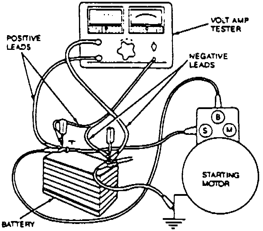 2. Disconnect starter from battery. Then reduce resistance of rheostat until voltmeter indicates same reading as obtained while starter was running. Ammeter will indicate no-load current draw, compare this to that of the specification chart.