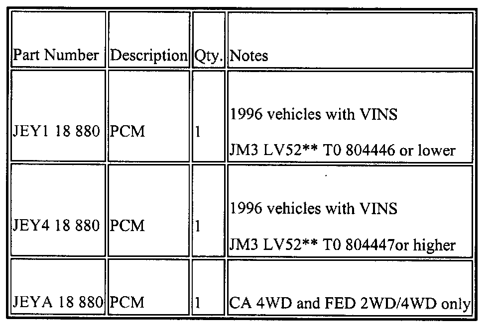 During cold weather conditions when the vehicle has been exposed to an ambient temperature of 0°C (32°F) overnight or several hours, engine is hard to start. Engine will crank and start at wide open throttle (clear flood mode). This hard to start condition is due to reformulated winter gasoline which easily vaporizes. It causes an over rich air-fuel ratio when the coolant temperature is approximately O°C (32° F). A modified Powertrain Control Module (PCM) is available which has a revised calibration to decrease the fuel injection pulse width when exposed to coolant temperatures of O°C (32°F).