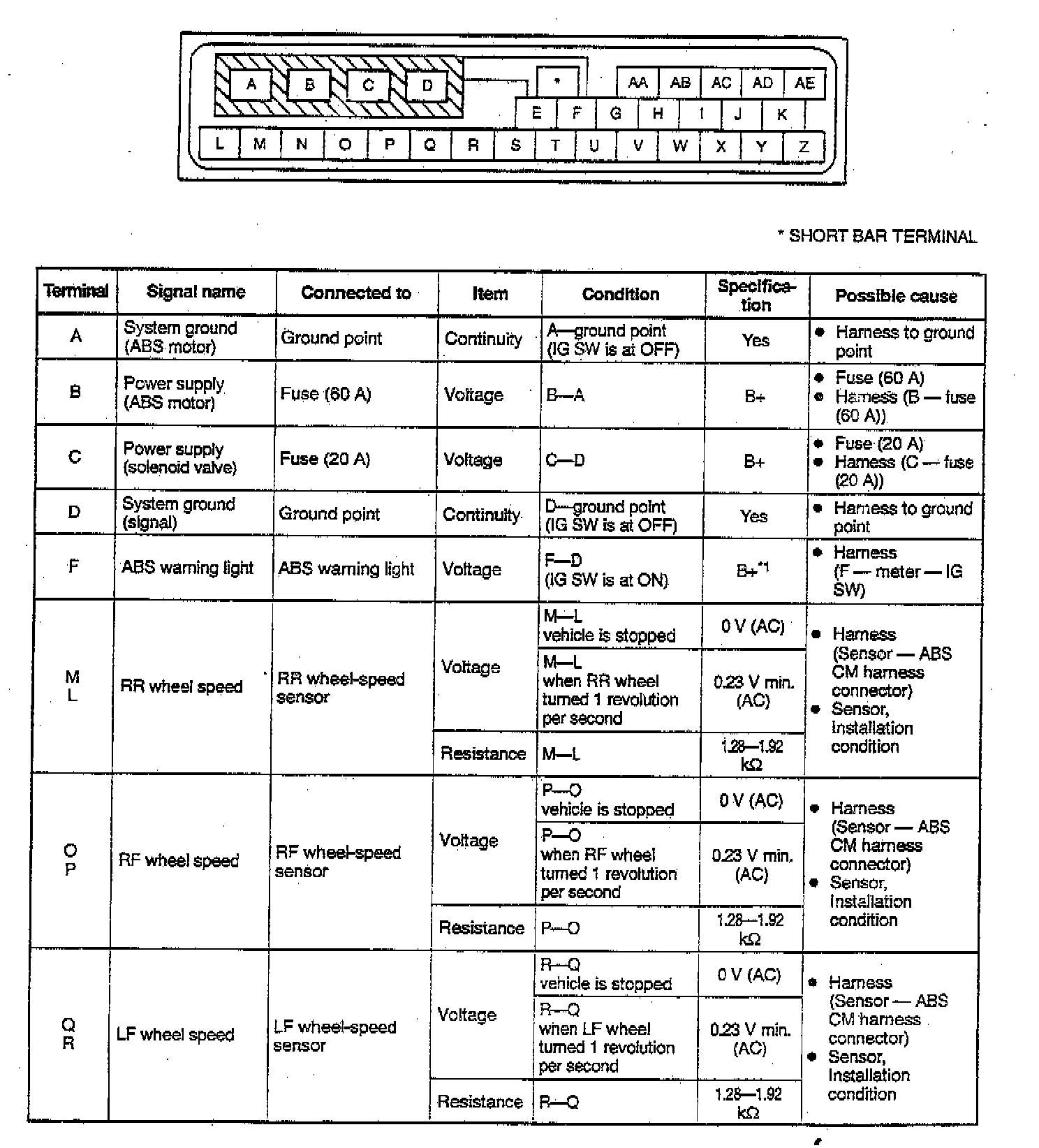1. Disconnect the ABS CM connector with the ignition switch at OFF.CAUTION: Be careful not to damage the terminals during inspection.
