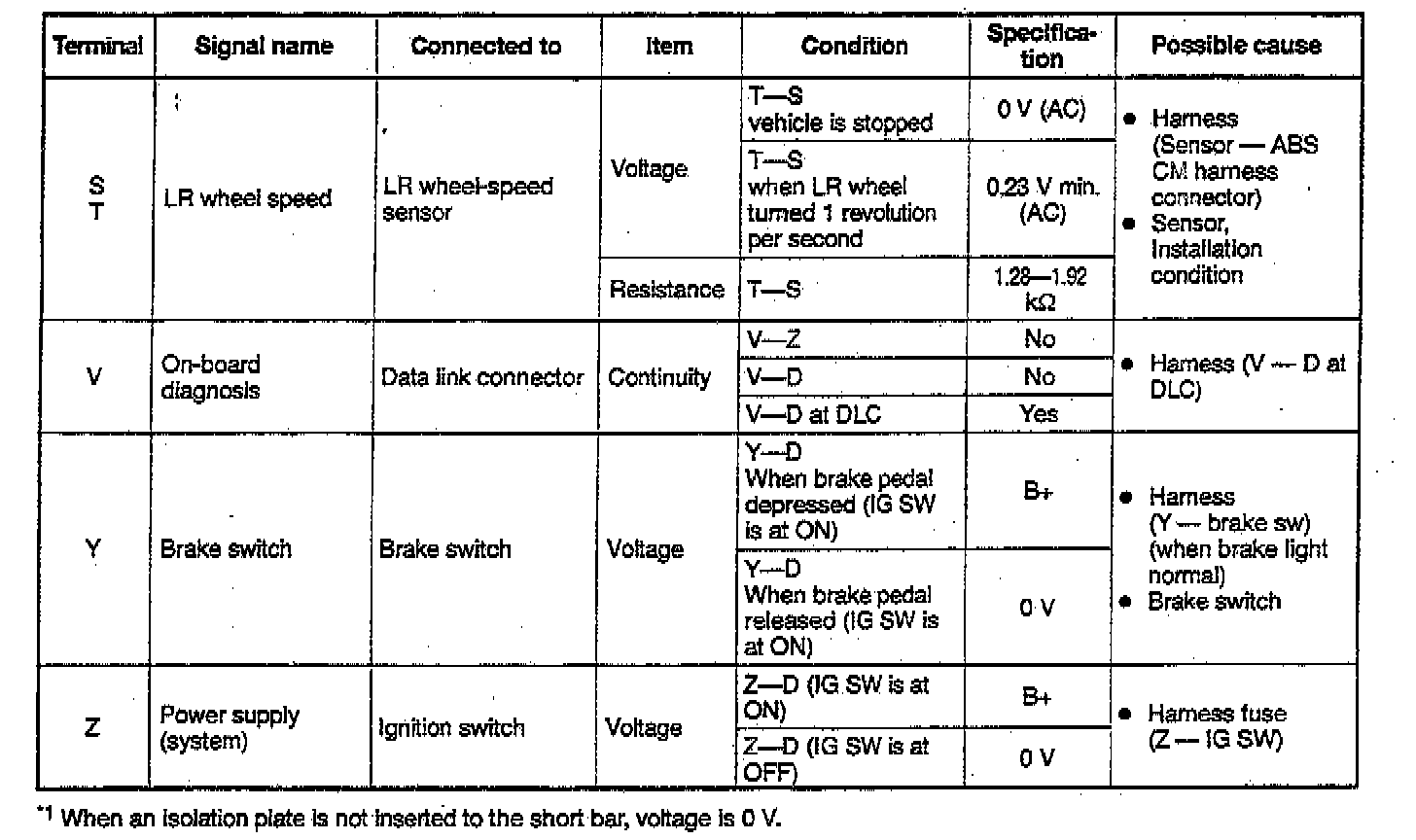 3. Attach a wire to the tester lead to avoid damaging the terminals then inspect voltage, resistance or continuity, referring to the following table.