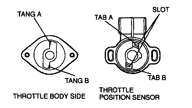 5. Open the throttle valve slightly and catch the tang of the throttle body on the throttle position sensor plastic tabs. Align tang A on throttle body with tab A on throttle position sensor. Note tangs on the throttle body mate with the tab on the throttle position sensor on the side of the tab without a slot.