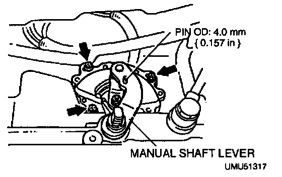 4. Align the holes of the transmission range switch and the manual shaft lever, and insert an approximately 4.0 mm (0.157 inch) outer diameter pin through the holes.
