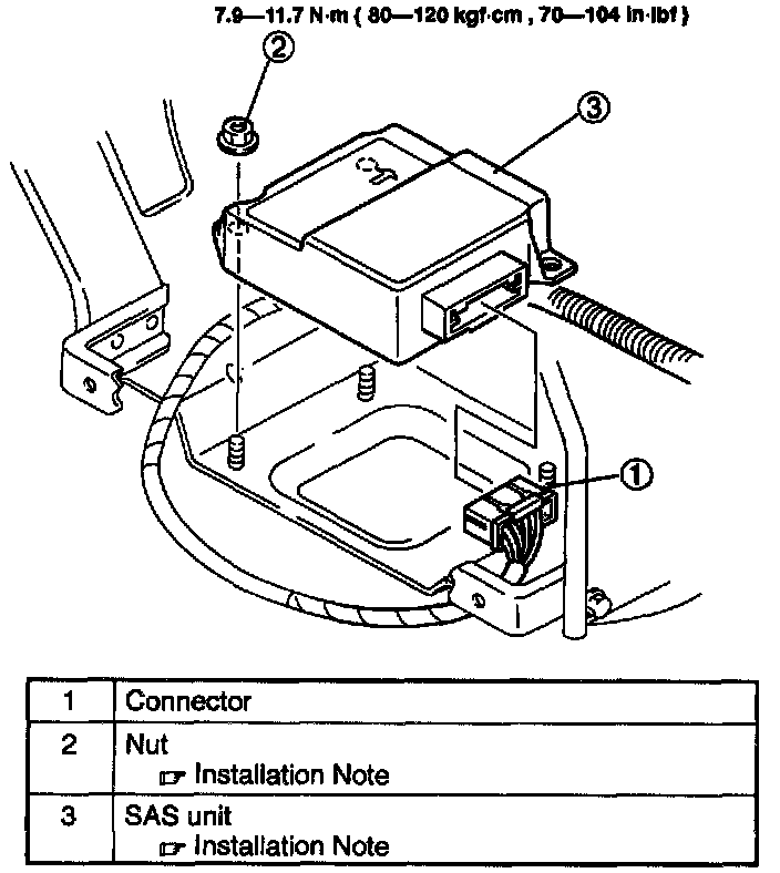 ^ New SAS units are not Input with a deployment approval signal in order to prevent accidental deployment of the air bag module during installation. Since the SAS unit is not yet input with the deployment approval signal, the air bag system will not operate In the event of an accident, which may result In serious Injury or death. Follow the procedures for inputting the deployment approval signal Into the SAS unit after replacement.