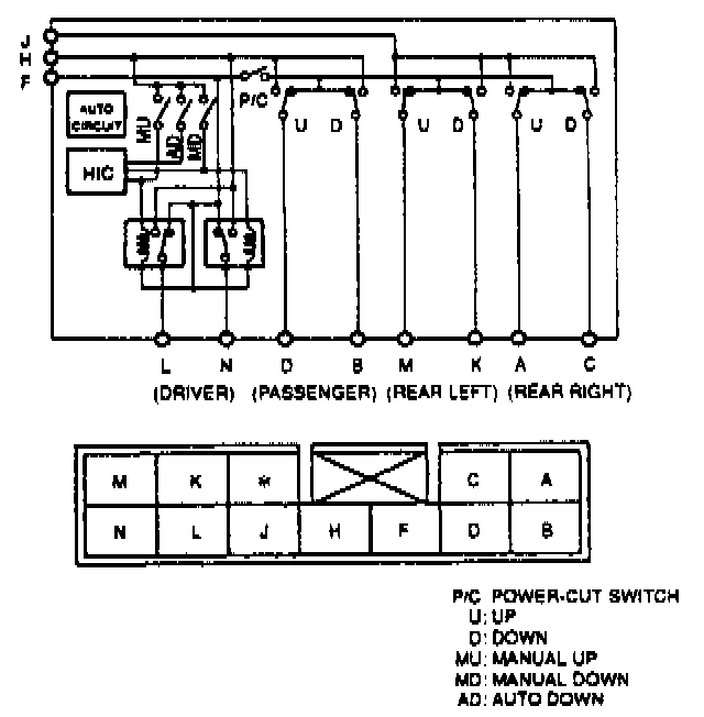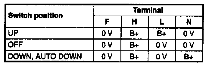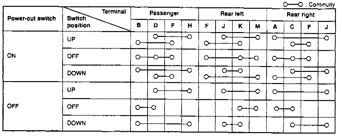 5. Check for continuity between the power window main switch terminals by using an ohmmeter.