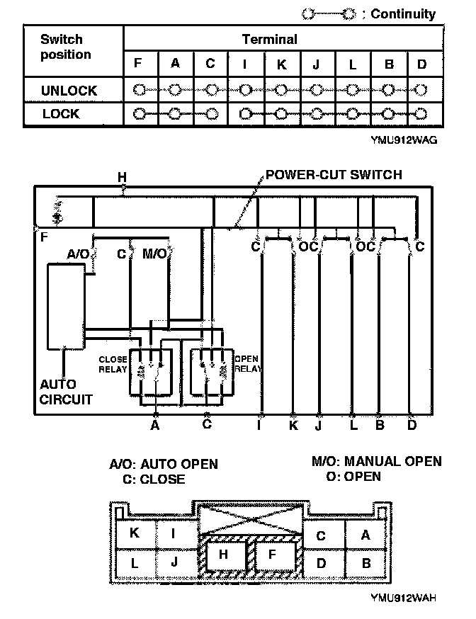 1. Remove the power window main switch.2. When inspecting the passenger's side and the rear, verify that the power-cut switch is at UNLOCK.