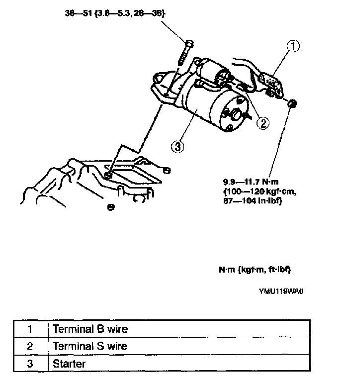 WARNING: When the battery cables are connected, touching the vehicle body with starter terminal B will generate sparks. This can cause personal injury, fire, and damage to the electrical components. Always disconnect the battery before performing the following operation.1. Remove the battery.