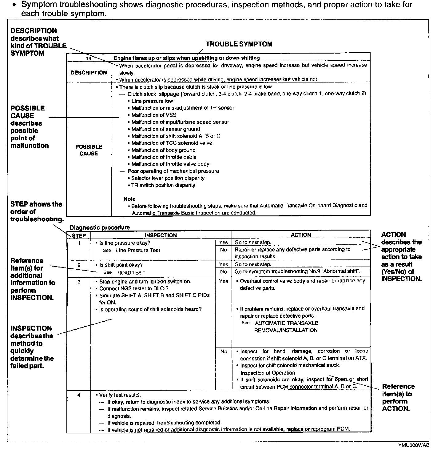 - The quick diagnosis chart lists diagnosis and inspection procedures to be performed specifically relating to the cause of the malfunction.