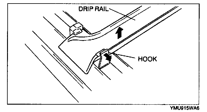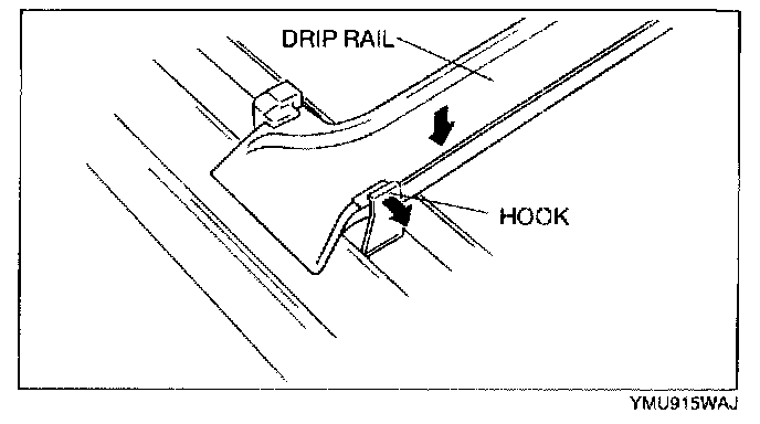 SUNROOF UNIT DISASSEMBLY1. Bend the hook of the decoration link rearward to remove the drip rail.
