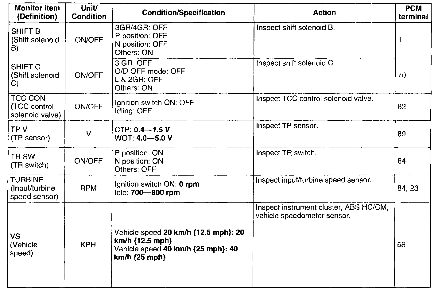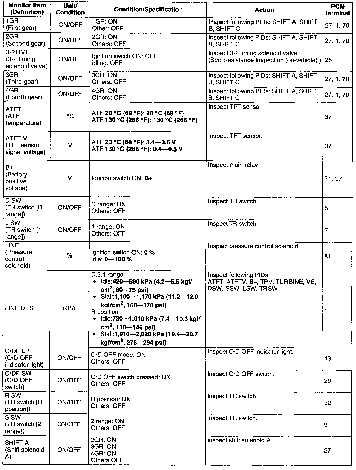 ^ The PID/DATA MONITOR function monitors the calculated value of the input/output signals in the PCM. Therefore, if a monitored value of an output device is out of specification, it is necessary to inspect the monitored value of the input device related to the output device control. Since an output device malfunction is not directly indicated as a malfunction of the monitored value for the output device, it is necessary to inspect the output device individually using the simulation function, etc.