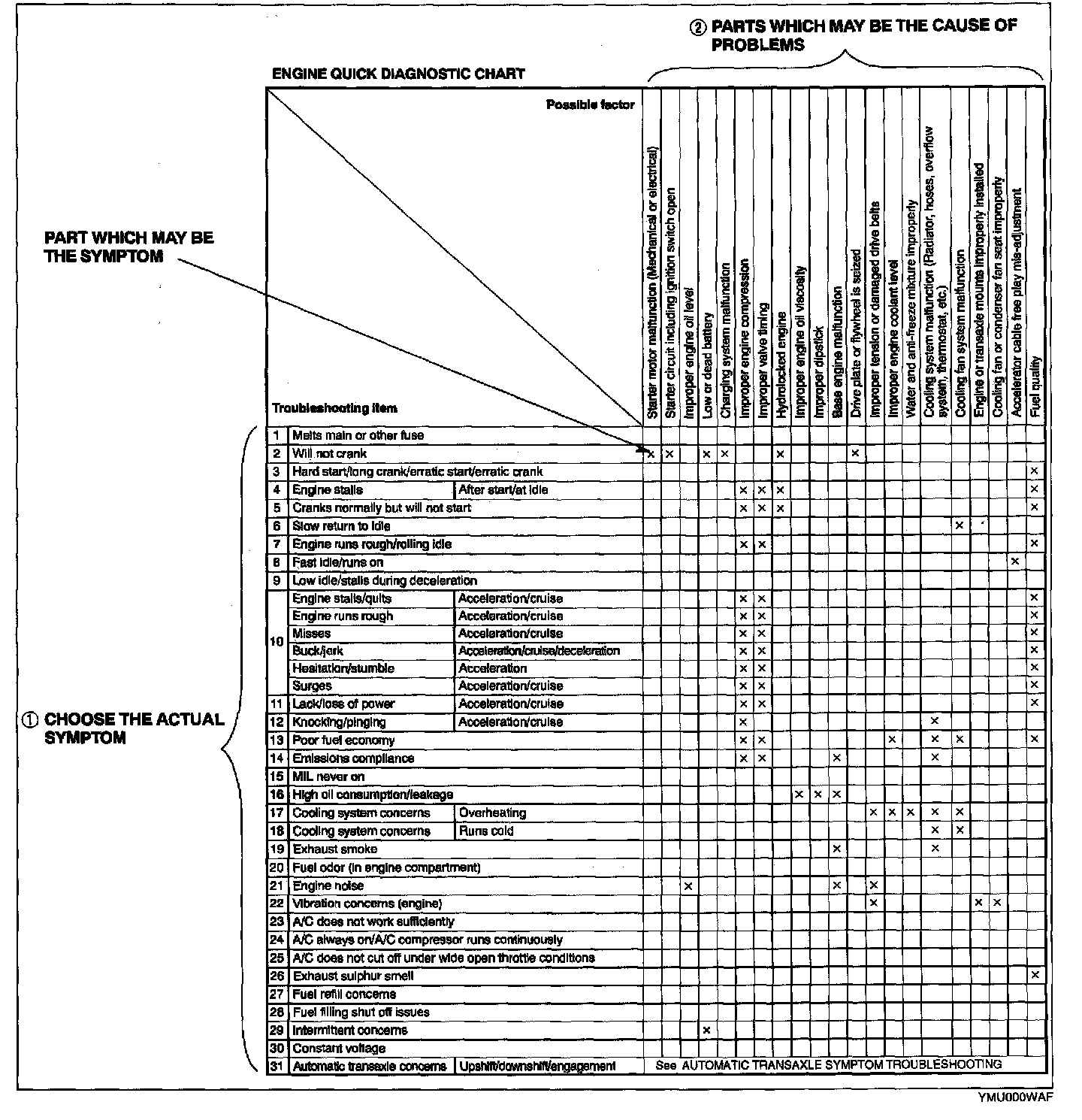 - The chart is effective in quickly narrowing down the relation between symptom and cause of the malfunction. It also specifies the area of the common cause when multiple malfunction symptoms occur.