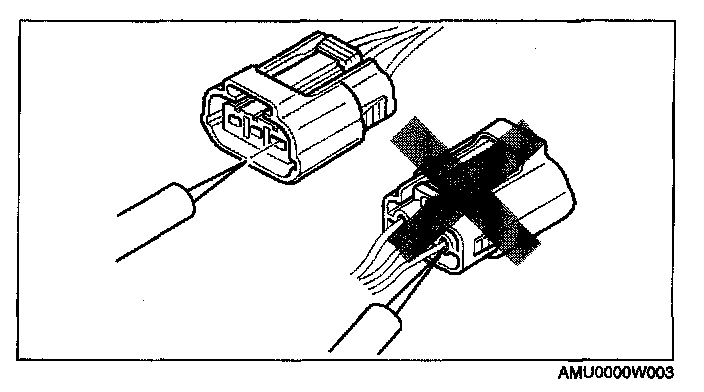- When a tester is used to inspect for continuity or measuring voltage, insert the tester probe from the wiring harness side.