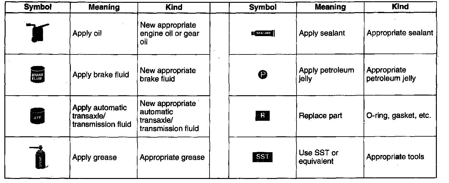 - There are eight symbols indicating oil, grease, fluids, sealant and SST (or equivalent) use. These symbols show application points or use of these materials during service.