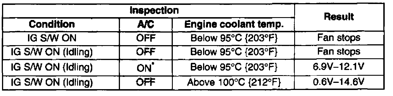 4. Measure the voltage at the terminal B of cooling fan motor connector from the harness side as shown in the table.
