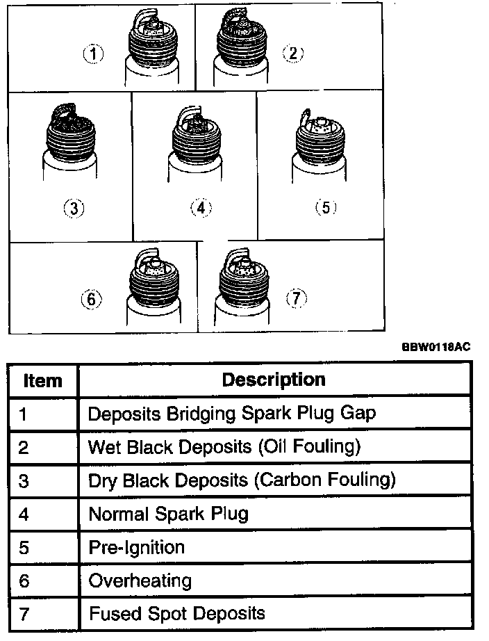 SPARK PLUG REMOVAL/INSTALLATIONNOTE: Refer to the chart in Step 5 to determine the condition of the spark plugs.