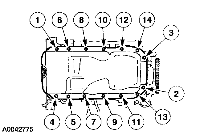 Oil pan torque and sequenceInstall the oil pan and tighten the bolts in two stages.