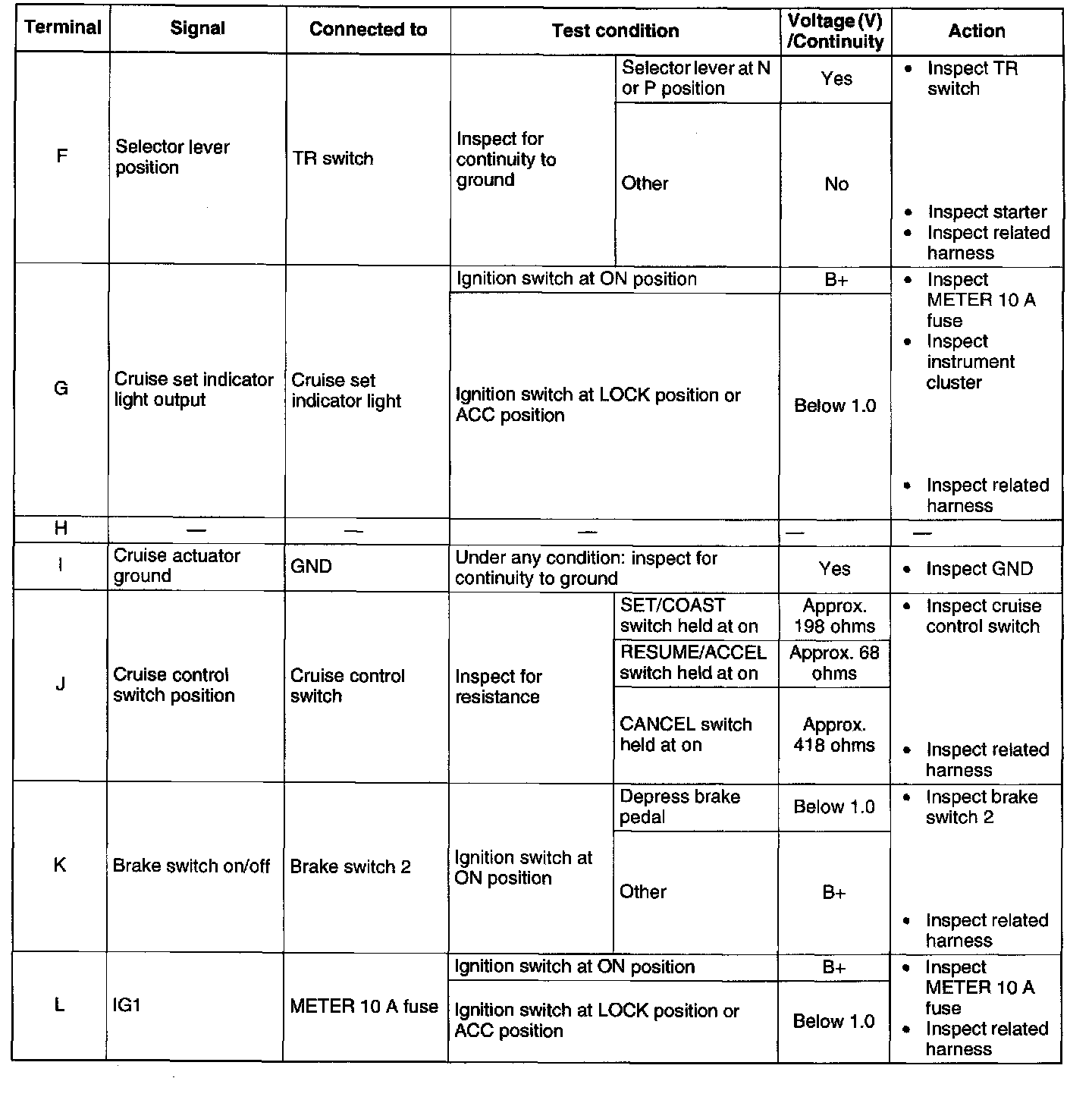 2. Measure the voltage, continuity and resistance at the cruise actuator terminals as indicated.